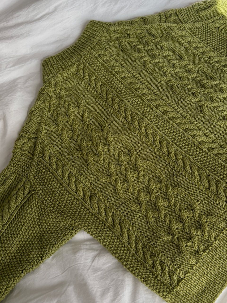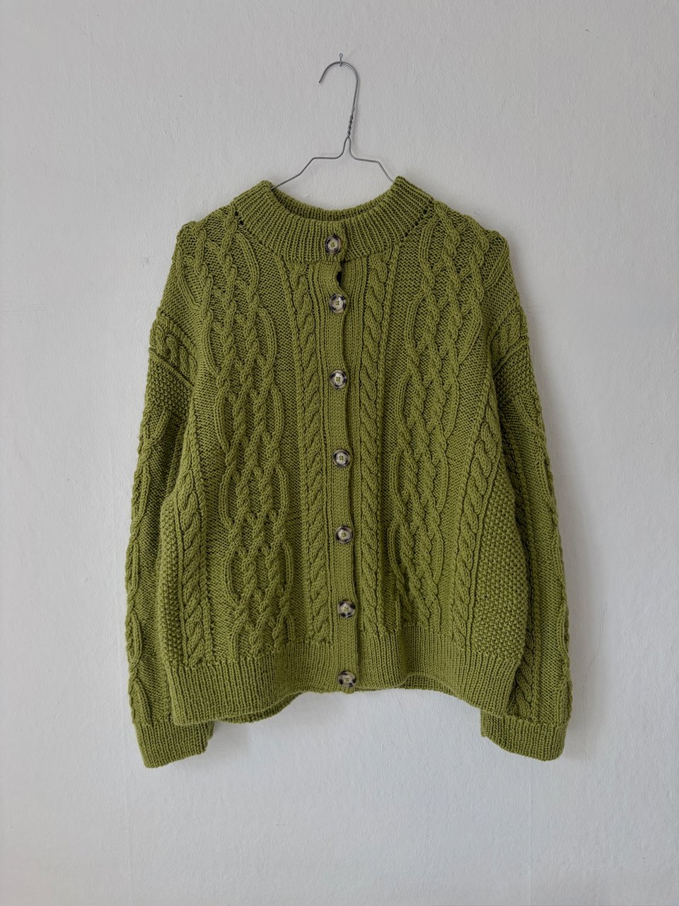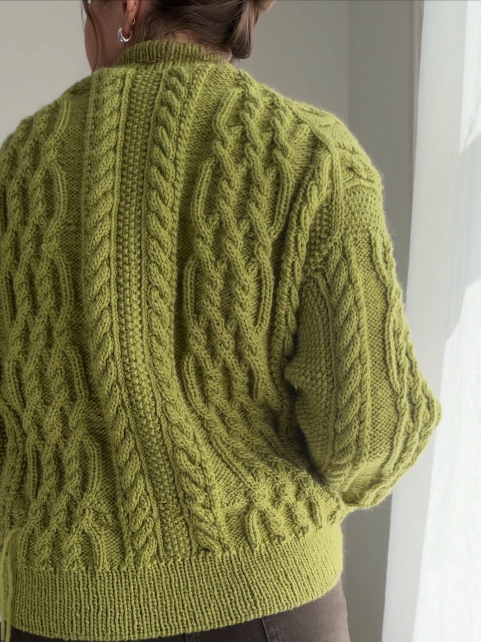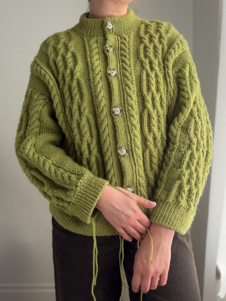 The cardigan is a beautiful and elegant oversized cardigan featuring cables, ribbed edges, and a double-knitted button placket. The cardigan is knitted top-down. The work begins with the upper back, where short rows are worked to shape the neckline and ensure a good fit. Then, the shoulders are worked separately before the front and back pieces are joined for the body, which is worked back and forth. The sleeves are knitted in the round. Finally, the button plackets are worked along the front edges, followed by a folded neckline.